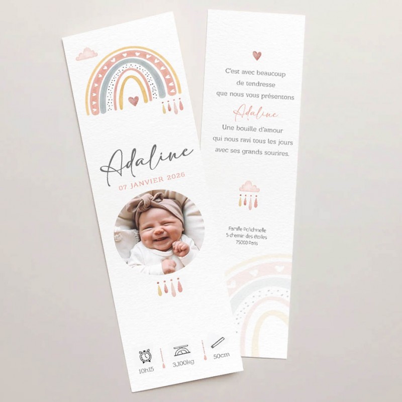 Annoncez la naissance de votre bébé avec un faire-part délicat et original au format marque-page, illustré d’un arc-en-ciel pastel dans de doux tons roses.