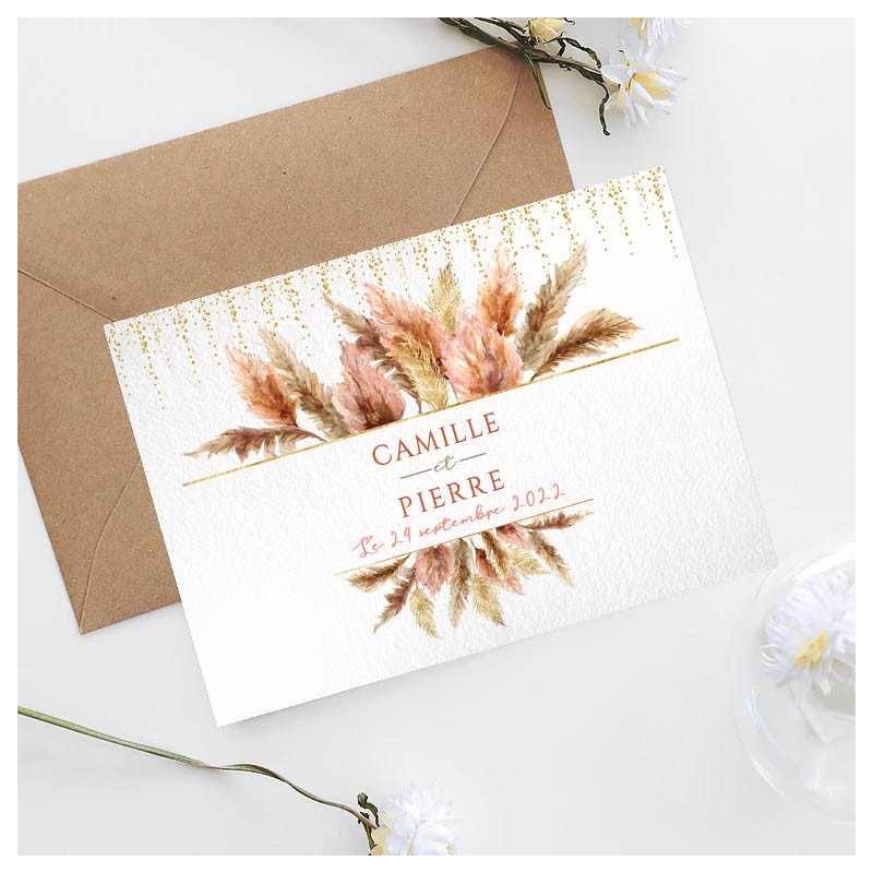 Un faire-part de mariage boho, naturel et romantique, illustré de fleurs de pampas dans de délicates teintes rose gold et terracotta, pour une annonce élégante et tendance.