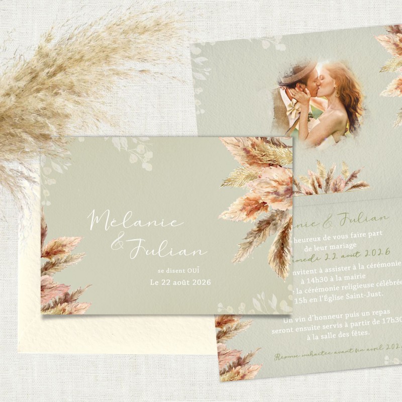 Ce faire-part séduit par son esprit bohème, à la fois tendance et intemporel, parfaitement adapté aux mariages en plein air ou aux ambiances naturelles. Les pampas, très appréciées pour leur côté poétique, renforcent l’atmosphère romantique et naturelle de ce modèle.